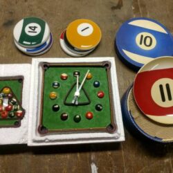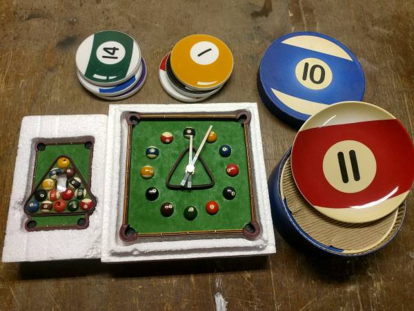 Comes with a set of balls, cues, chalk, etc, plus some neat decor.