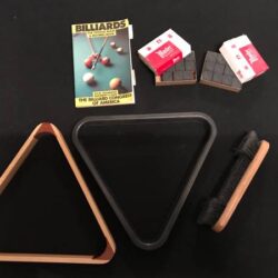 Includes balls, two racks, cue sticks including bridge stick, chalk, table brush, cue stick corner rack, rule book.