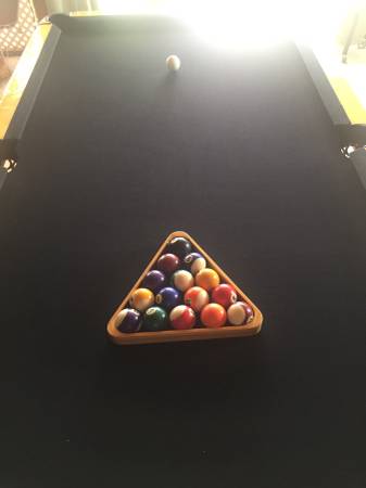 7ft table, barely used comes with 4 full sized cues, 1 short, and one kid sized and all accessories Must arrange pick up and move.
