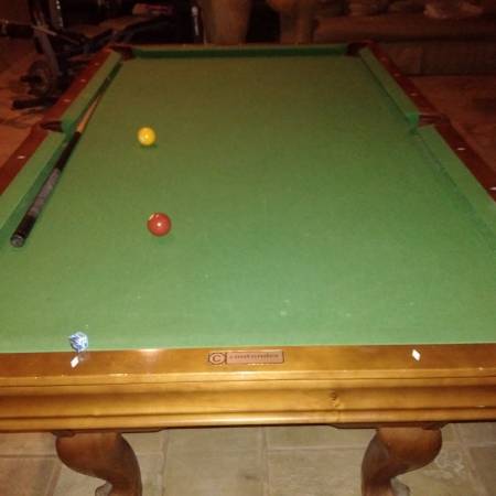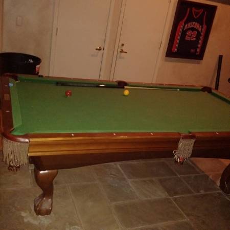 7ft table, barely used comes with 4 full sized cues, 1 short, and one kid sized and all accessories Must arrange pick up and move.